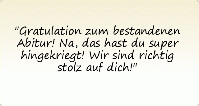 Herzliche glückwünsche zum bestehen deiner abschlussprüfungen. .. Geschafft ist die schulzeit, jetzt kann das leben beginnen, kannst du dich voll auf deine stärken besinnen, geschafft das abitur, dazu gratulieren wir, wir stehen auch weiter hinter dir.